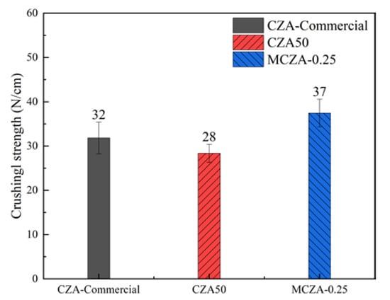 As depicted in Figure 12, the average crushing strengths of CZA-Commercial, CZA50, and MCZA-0.25 were 32 N/cm, 28 N/cm, and 37 N/cm, respectively. In our previous study, the average crushing strength of CZA-Commercial decreased from 32 N/cm to 4 N/cm after a hundred times cold start-up of an online MSR system [25]. The modified sol–gel method inherited the advantages of the high-loading capacity of the conventional sol–gel method and the high mechanical strength of the impregnation method. Compared with CZA50 and CZA-Commercial, the average crushing strength of MCZA-0.25 is higher by 32.1% and 15.6%, respectively. The mechanical strength was improved mainly because of the support and dispersion effect of γ-Al2O3 powders. Additionally, raw material costs can be reduced by using γ-Al2O3 powders to prepare Cu/ZnO/Al2O3 catalysts because the price of γ-Al2O3 powders is lower than aluminum nitrates. The preparation process is easy to operate and saves many water resources. Therefore, the MCZA-025 shows commercial potential in terms of the preparation cost and catalytic activity.