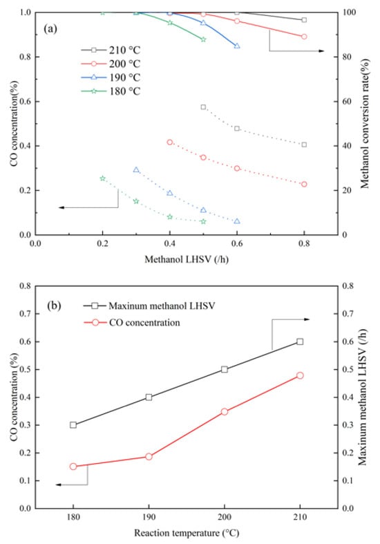 The effect of methanol LHSV and reaction temperature was studied over MCZA-0.25 to achieve a reforming gas with low CO concentration and high H2 production. As shown in Figure 13a, the CO concentration increases with the increasing reaction temperature, whereas it decreases with the increasing LHSV. There exists a maximum methanol LHSV when the methanol conversion rate reaches 100% at a specific temperature, where the corresponding CO concentration can reach the minimum value. Furthermore, Figure 13b demonstrates a linearly positive relationship between the maximum methanol LHSV and reaction temperature. The corresponding CO concentration increases as the temperature increases. Consequently, a low CO concentration or a high H2 production can be acquired by adjusting the reaction temperature and methanol LHSV for different application situations. For example, high reaction temperature and methanol LHSV are suitable for high-temperature PEMFCs since they can tolerate up to 1% of CO content. Conversely, low reaction temperature and high methanol LHSV are necessary for minimizing CO concentrations in low-temperature PEMFCs where their CO tolerance is usually not more than 10 ppm [32]. At a temperature of 180 °C and the maximum methanol LHSV of 0.3/h, the reforming gas achieves a CO concentration as low as 0.15%. Although this gas cannot be directly utilized in low-temperature PEMFCs, reducing its CO content helps decrease costs associated with CO deep removal processes such as preferential oxidation and pressure swing adsorption (PSA).