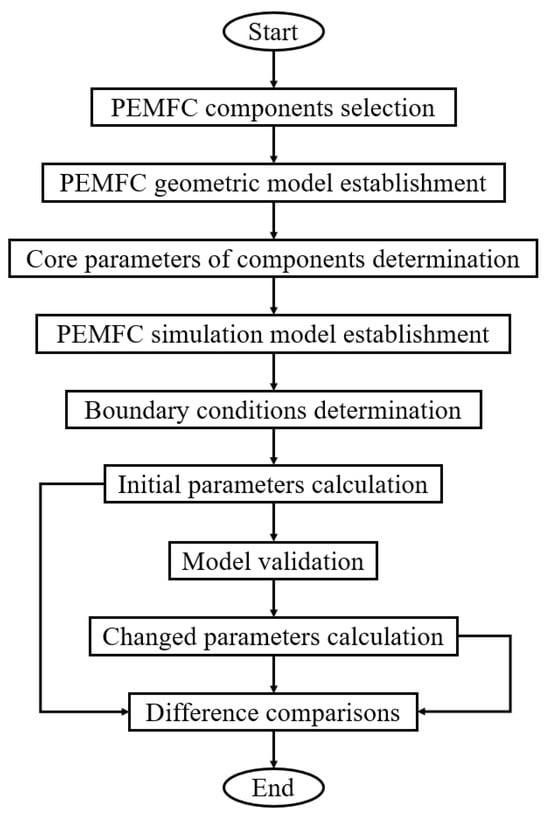 The schematic of the PEMFC degradation simulation is shown in Figure 1. Firstly, the PEMFC components, including the PEM, CL, GDL, and BP, are selected. Moreover, the geometric model shown in Figure 2 is established. Secondly, the core parameters of components characterizing the performance degradation of the PEMFC are determined. Thirdly, the boundary (operating) conditions are determined according to the experimental operating conditions because the degradation rate is dependent on the operating conditions. Additionally, the calculations of the initial and changed parameters are conducted. Finally, the difference in the calculation results obtained based on the above conditions is compared.