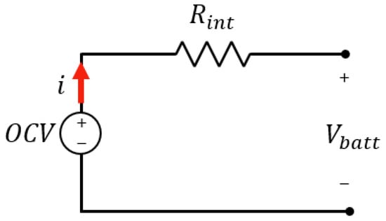 The most straightforward version present in the literature is the simple battery model [36,37], which allows a quantitative study of battery behavior without excessively investigating the internal electrochemical processes. The following electrical circuit model (ECM) consists of an ideal voltage generator, the , and an (internal) series resistance, such as , both generally dependent quantities from the SOC and temperature.