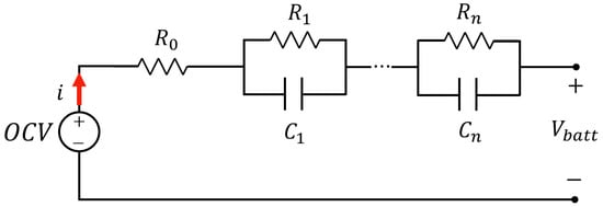 The previous model can be generalized to n-RC networks (Figure 4) to introduce more time constants and, therefore, analyze the behavior of the ESS in greater detail. However, the complexity increases the computational cost since it is necessary to extract the values of each component of the equivalent circuit to identify the experimental curves, thus reducing the possibility of use in real-time-type applications.