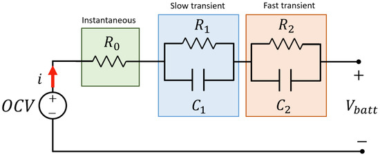 The circuit of Figure 3 allows the study of the dynamic and transient behavior; a parallel RC network is added to model the transient response caused by the flow of lithium ions in the electrolyte, and in the negative electrode , and respectively constitute the resistance and the polarization capacity. These terms describe how the voltage varies as a function of the current. These parameters, as well as the and , are functions of the SOC and the battery temperature [40].
