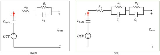 The 1RC and 2RC models presented can be equipped with an additional bulk capacitor placed in series with the , respectively, giving rise to the PNGV (Partnership for a New Generation of Vehicles) and GNL (general non-linear) model in which this additional element models the variations of this voltage during load application and reflects the capacity of the storage system [43,49,50,51,52] (Figure 7). These dependencies will be integrated into the 2RC model, taking into account an accurate identification of the , exploiting special discharges at low C-rates, and a precise imposition of the capacity exhibited by the cell concerning the discharge power and the operating temperature.