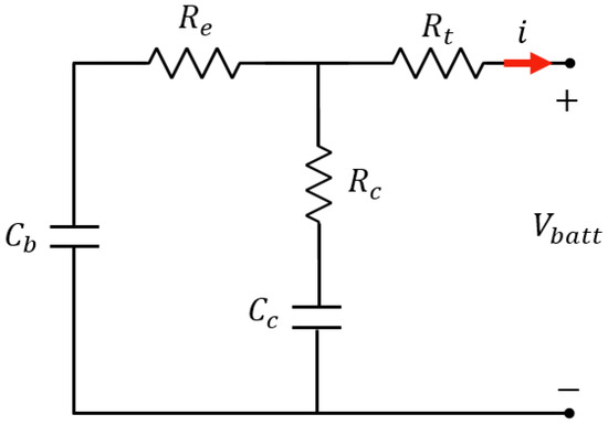 This model exploits two capacitors and three resistors, as evident in Figure 8, noting how the ideal voltage generator associated with the open-circuit voltage is absent . In detail [41,47], the capacitor , of modest value, models the effects of the surface nature of the storage and the double layer (EDL). In contrast, represents the battery’s energy capacity (storage charge) and has a decidedly higher value than the previous one.