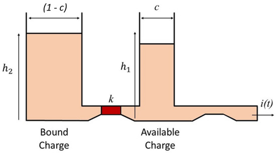 As for the temperature profile, it is necessary to monitor the behavior of the SOC, which is such a crucial parameter for analyzing the circuit’s behavior in response to a current excitation and contributing to the identification phase of the 2RC electrical parameters. In literature, the Kinetic Battery model is combined with the 2RC model to evaluate the state of charge. This model supposes the battery as a structure composed of two wells, Figure 10, one contains the available charge, which flows directly into the load, while the other contains the bound charge, which refills the available charge well through a valve, k. The difference between good heights regulates the exchanged charge. represents the SOC that becomes zero when the battery is fully discharged.