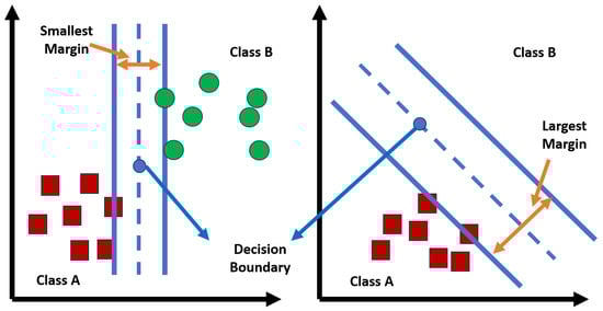 - Support Vector Machines (SVMs): SVMs are supervised learning algorithms that can be used for classification and regression tasks. They work by finding the optimal hyperplane that separates data points into different classes or predicts a continuous output variable (Figure 13). SVMs are effective for battery modeling as they can handle high-dimensional data and non-linear relationships. In battery SOC estimation, SVMs can be trained using a dataset of input variables such as voltage, current, temperature, and corresponding SOC values. The SVM then finds the hyperplane that can best separate the data points and create a model that can accurately predict the SOC for new input data. Additionally, SVMs have a robust generalization ability, meaning they can perform well on unseen data. This is important for battery SOC estimation as the model needs to accurately predict the SOC for various operating conditions, not just the ones it was trained on. Furthermore, SVMs effectively handle noisy data, which is common in battery systems due to external factors such as sensor errors or variations in battery chemistry. By accounting for noise in the training process, SVMs can create a more accurate SOC estimation model. Table 2 shows a summary of the works in which SVM was used for SoC estimation.