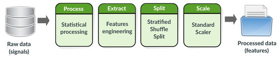 The power system stability dataset was produced from the extensive set of time-domain simulations on the IEEE New England 39-bus benchmark test power system, with varying degrees of loading and three different short-circuit types scattered throughout the network. Further details on the benchmark power system, time-domain simulations, and dataset construction can be found in [33]. The full 3.8 GB dataset of PMU signals was deposited on Zenodo with a CC BY license [34]. These raw signals were further processed according to the pipeline graphically depicted in Figure 1. It consisted of following steps: a statistical processing of data cases (from systematic into the stochastic domain), extracting features from the time-domain signals, splitting the data into training and test sets, and scaling them. The processing of data cases by random sampling without replacement followed a probability distribution of short-circuit events found in the actual power systems [33]. The splitting strategy used a stratified shuffle split in order to preserve the class imbalance between stable (majority) and unstable (minority) cases. The scaling standardized (training and test) the datasets by removing the mean and scaling them to a unit variance.