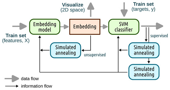 As can be seen from Figure 2, the unsupervised learning loop uses only data features (matrix X), while the supervised learning loops additionally use targets (vector y) that are fed to the classifier. In addition, supervised learning can optimize the entire pipeline (outer loop), or only the classifier (inner loop). The hyperparameter optimization (both of the embedding method and of the SVM classifier) was carried out using the same simulated annealing algorithm described in Section 2.2. Only the objective function was different, as is explained next.