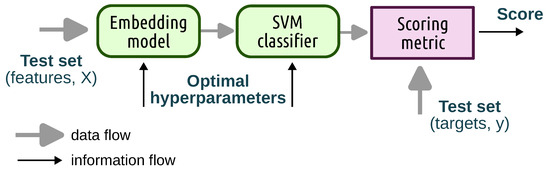 The SVM binary classifier, trained with supervised learning on top of the embedding, was scored on the test set. The scoring metric is reported as the mean value with a standard deviation (), obtained from a 3-fold cross validation. The process of scoring the model is graphically visualized in Figure 3. It can be seen that the embedding model (as a transformer) and the SVM classifier constituted a pipeline, which was fed the test dataset along with the optimal hyperparameters obtained from the training phase. The classifier produced predictions, which were compared to the ground-truth values (i.e., test-set targets) and a certain metric was reported as the score (i.e., measure of test accuracy). Since the dataset was class-imbalanced, we used the -score as the harmonic mean of the classifier’s precision and recall, i.e., , where TP is a true positive, FP is a false positive, and FN is a false negative outcome (from the confusion matrix of the classifier).
