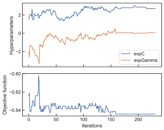 First, in order to demonstrate the convergence of our modified simulated annealing algorithm for hyperparameter tuning, as an example, Figure 4 presents the algorithm’s convergence when optimizing the hyperparameters of the kPCA model using the unsupervised learning approach. It can be seen that the algorithm attained convergence before reaching 200 iterations.