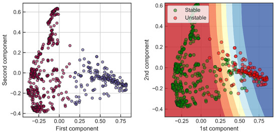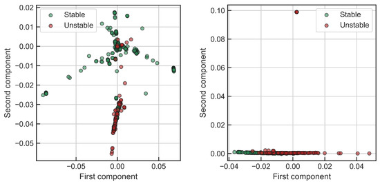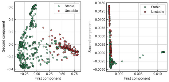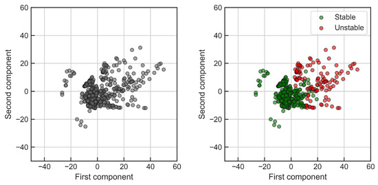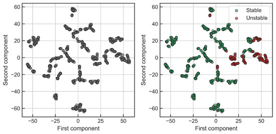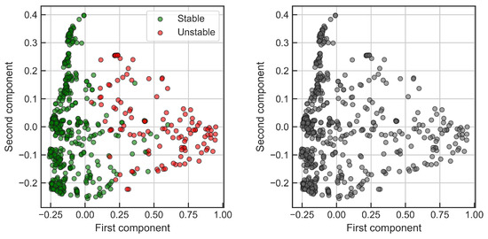 Unsupervised learning can be extended a step further by applying clustering on top of the low-dimensional embedding; see for example [45]. We used K-means clustering for separating the low-dimensional space of samples into stable and unstable cases [38]. Since we knew a priori that there are only two classes (stable and unstable), we assigned the K-means clustering with (hopefully) finding these clusters withing the embedding space.