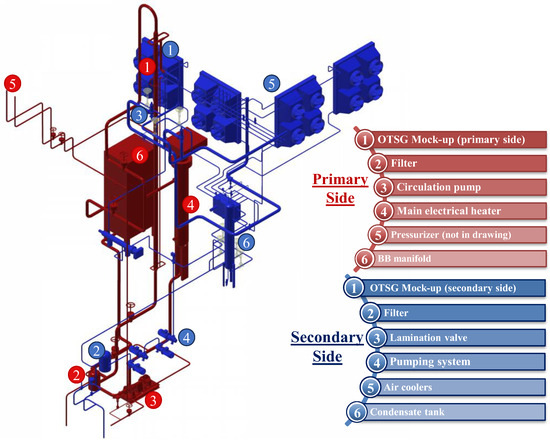 Single-phase (liquid) pressurized water is the primary working fluid, while two-phase (liquid/steam) pressurized water is the secondary one. Both the systems will be controlled by a dedicated Data Acquisition and Control System (DACS) based on the LabView software platform Version 2021. The two loops are hydraulically independent but thermally connected by means of a test section (i.e., the OTSG). The preliminary Computer-Aided Drafting (CAD) of the two loops is depicted in Figure 2. The components are strategically installed within the existing structure, integrated with a specific designed new structure to accommodate the experimental infrastructure.