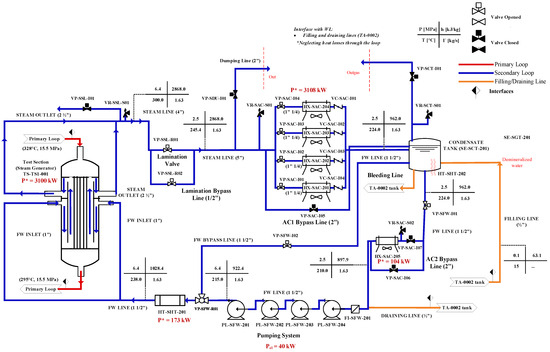 The secondary system plays a fundamental role in extracting the thermal power from the primary loop, supplying the feedwater to the OTSG mock-up during all the different operational phases of the facility. The loop replicates the conditions of the DEMO Power Conversion System (PCS), which entails an operating pressure of 6.4 MPa and OTSG inlet-outlet temperatures of 238–300 °C. Considering the PCS thermal cycle, the feedwater mass flow rate needed to efficiently remove the power in nominal conditions is 1.68 kg/s. In particular, the loop is divided in two sectors: the first one including the OTSG mock-up is operated at the DEMO PCS conditions (see above), while the second one, including the final heat sink of the facility (i.e., the Air Coolers, AC), is operated at 2.5 MPa with a thermal cycle of 245.4–210.0 °C. The secondary system PFD is reported in Figure 4, while main working parameters are summarized in Table 3.