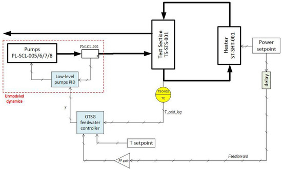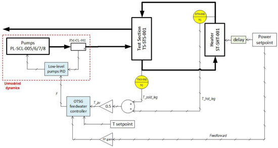 The control schemes are tested on a STEAM dynamic simulator specifically implemented using the 1D Modelica language version 3.5 [26] and simulated using the Dymola environment from Dassault Systèmes Version 2022 [27]. Validated components of the ThermoPower thermal-hydraulic library [28] have been employed. This approach is identical to the one commonly employed by PoliMi for dynamics modeling & simulation and for control design in fission power field (e.g., [29]). Both the primary loop and the OTSG are completely reproduced, while, concerning the secondary loop, only the section between the heater HT-SHT-201 and the lamination valve VP-SSL-R01 is modeled. This open-loop assumption is equivalent to assuming that the choked valve VP-SSL-R01 effectively decouples the dynamics of the test section from the rest of the loop.
