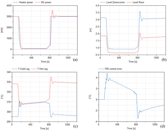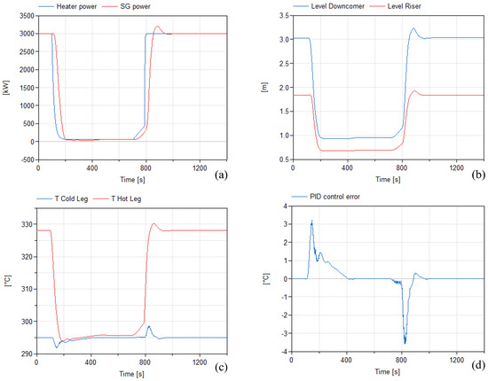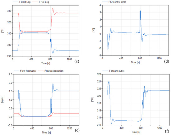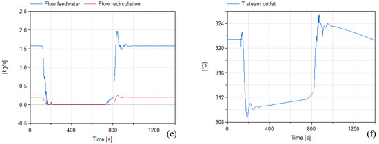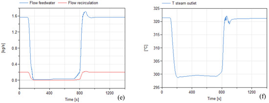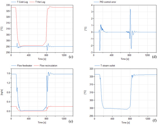 From the comparison of the results of Figure 8 and Figure 9, an improvement in the readiness of the control can be noticed in the scheme 2, where the system reaches steady states significantly faster and with reduced peaks in feedwater mass flow rates. The reason is that this control logics adopts as only temperature feedback signal the OTSG tube-side outlet: this signal has minimal measurement delay and the heater dynamics does not act as a practical output disturbance directly on a feedback signal. On the contrary, the tube-side inlet temperature measurement presents a significant time delay since the heater power, which can be interpreted as a sort of output disturbance—acts between the control action and the measurement point.