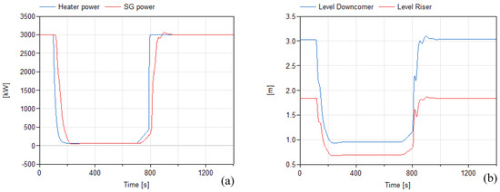 - full power steady state: the primary system is operated at the nominal power (i.e., 3.1 MW supplied by the main heater). The pressure in kept at 15.5 MPa and the OTSG inlet-outlet temperature is 328–295 °C, while the pump elaborates the nominal flow rate. In the secondary system, both the feedwater line and the lamination valve on the steam line are open. The high pressure section operates at the nominal pressure of 6.4 MPa, with a OTSG inlet-outlet temperature of 238–300 °C. Downstream the lamination valve, the air coolers are switched on, performing the de-superheating and condensation of the steam produced in the OTSG, allowing in such a way the operation of the system as a closed loop. The condensate is collected inside the condensate tank, which is kept at 224 °C and 2.5 MPa. The pumping system elaborates the nominal flow rate to the feedwater line (recirculation line closed). The electrical heater downstream the 3-way valve is activated in order to pre-heat the feedwater up to 238 °C.