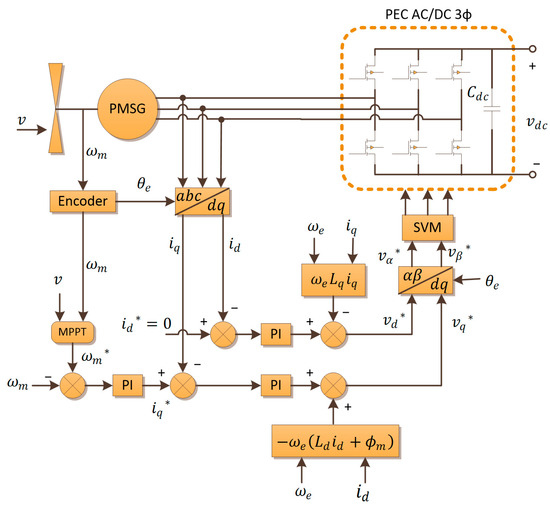 In this circuit, is the electrical circular frequency of the PMSG and is calculated according to Equation (12). is the stator phase resistance, is the DC side capacitor, is the DC bus level, and are the modulation signal, and and are the direct and quadrature stator inductances.