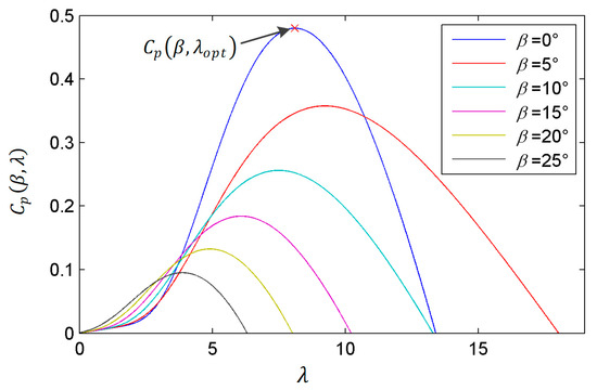 The power coefficient described in Equations (3)–(5) for different attack angles and speed ratios is shown in Figure 2. As can be seen in this figure, reaches a maximum value for a given , known as the optimal (). For the model presented in Equations (3)–(5), the takes a value of 8.1, and with this value, the reaches a maximum value of 0.48 when . Therefore, represents the speed ratio with which the power of the wind is transformed into mechanical power to the greatest extent possible. This means that for a given wind speed, the turbine has an angular speed () at which the greatest possible amount of energy is extracted. This angular speed can be determined by substituting in Equation (3), resulting in Equation (6).