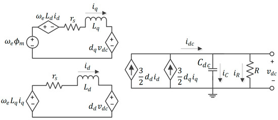 To define the component of the stator current in the q-direction, the equivalent circuit of the electrical part of the wind system is considered, including the generator and the three-phase rectifier with a resistive load connected on the DC side, in dq coordinates as shown in Figure 3. A more detailed proceeding to obtain this model is presented in [41,42].