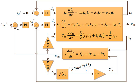 Synthesizing the modeling of the wind system described by Equations (1)–(15) and including the PI controllers for the schematic of Figure 1, this system is represented as a block diagram in Figure 4.