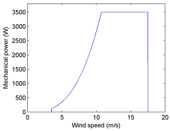 In Figure 1 and Figure 4, is the target angular velocity determined by the MPPT algorithm. One of the typical algorithms for controlling a wind system starts by measuring the wind speed. This variable determines an angular velocity, an attack angle for the blades, and/or a transmission ratio between the turbine and the generator that maximizes the power factor [43,44]. This ensures that the maximum possible mechanical power is extracted. However, in systems such as the one implemented in this study, there is no control over the attack angle, which is fixed, or the transmission ratio. Only the angular velocity of the blades is controlled by regulating the electrical torque of the generator. Additionally, since the system is designed for low generation (small wind), it operates within limited ranges of mechanical power, angular speed of the blades, and wind speed. Once these limits are reached, the angular speed acquires values that regulate them and does not necessarily extract the maximum available power. Figure 5 shows the operational curve of the wind system implemented in this research. It has two cut-off wind speeds: a lower one of 3.5 m/s, below which the generator does not extract enough energy to transfer it to the DC side of the rectifier, and a higher one of 17.5 m/s, beyond which the current required in the generator to maintain the mechanical power at the limit exceeds its capacities. It is also observed that the curve in the generation range is divided into two regions: one below the limit power, where the maximum available power is extracted and/or the maximum angular velocity of the blades is regulated, and another where the system regulates the mechanical power to keep it at the limit value [45]. For the system studied in this research, the maximum angular velocity of the blades is 48.69 rad/s, and the maximum mechanical power allowed is 3500 W.