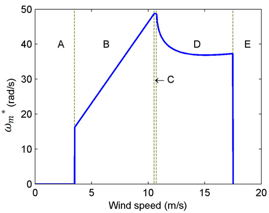 To cover the system’s limitations and determine the blades’ angular velocity as a function of the wind, Equations (1)–(8) were solved for the different operating states described by the generation curve, obtaining the relationship shown in Figure 6. This relationship is divided into five cases identified as A to E. In cases A and E, the system is outside the production range, so it is disconnected. In case B, the angular velocity of the blades maximizes the power factor, and the maximum possible mechanical power is extracted (that is, ). The angular speed limit has been reached in case C, so it remains constant. Finally, in case D, the mechanical power extracted at constant angular speed reaches the allowed limit, so the rotation speed is decreased to maintain a constant power output. With defined for each value of in the operating range, the control algorithm simplifies the measurement of the wind speed and the setting of a reference value () for the nested control loops in Figure 1. This control strategy is well known and does not represent the research contribution of this paper. The paper focuses on implementing the HIL platform using relatively low-cost, student-oriented hardware, described with a high-level description language and with relatively limited hardware resources. Implementing a well-known control strategy provides a solid foundation for the HIL platform validation.