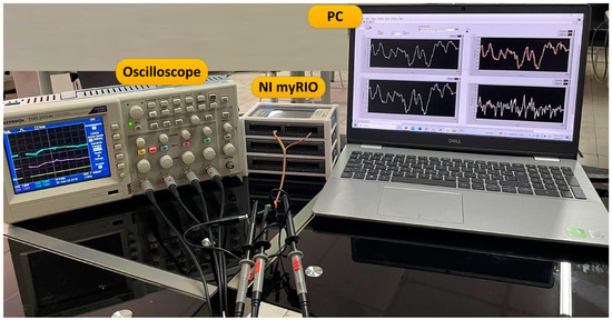The wind system model and control system were organized on the FPGA of the myRIO in two loops. The first loop includes Equations (16)–(19) and a 1D-LUT for the function and is executed every 10 µs. The second loop includes a 1D-LUT for the function and three PI controllers implemented with Equation (20), running every 25 µs. In Figure 7, the layout of the wind system and the control algorithm on the myRIO are shown. With this division, the control algorithm can be modified without altering the loop containing the wind system model. On the other hand, Figure 8 shows the HIL platform composed of a PC to emulate the wind behavior, the NI myRIO 1900, and a four-channel oscilloscope for monitoring the variables , , , and .