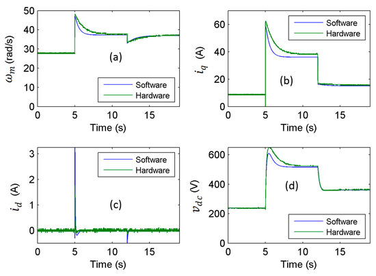 To validate the operation of the wind system, the results obtained from the hardware implementation were compared with the results of a continuous model simulation in Matlab. The first experiment evaluated the system’s response to a stepped wind speed profile, starting with a value of 6 m/s, then transitioning to 17.5 m/s, and finally returning to 8 m/s. The variables compared included the angular velocity of the blades, the currents in the q and d directions, and the DC voltage. These comparisons are shown in Figure 9, items (a) to (d), respectively. The platform’s accuracy in reproducing these variables’ behavior was measured by calculating the mean absolute error using the simulation values as a reference. The errors found for , , , and correspond to 0.7 rad/s, 1.9 A, 0.04 A, and 9.5 V.