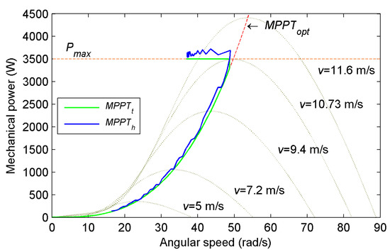 Figure 11 shows the trajectory followed by the mechanical power of the system. In this figure, the dotted red line labeled represents the theoretical optimal trajectory that touches the maxima of the extracted mechanical power function for any wind speed. The extracted mechanical functions are presented with gray dotted lines for different speeds. These curves have similar shapes to the function presented in Figure 3. As can be seen in Figure 11, for each value of wind speed, there is an angular speed that reaches the maximum value of the extracted mechanical function; this is the value that satisfies Equation (6). Ideally, a wind system should extract the maximum power for every wind speed. However, the mechanical power that the turbine can support is reached for a specific value. The dotted red line represents the limit power the studied wind system can extract. The green line, , represents the theoretical trajectory of the studied system. This trajectory follows the line until the limit angular velocity is reached (segment B of Figure 6), then it rises vertically while maintaining constant and increasing until the trajectory intersects the line (segment C of Figure 6). From this point, begins to decrease, maintaining the trajectory on the line (segment D of Figure 6) until reaching the upper cut-off wind speed of the operating range. Finally, the blue line, , represents the trajectory followed by the wind system implemented with the control algorithm. As shown in Figure 11, the trajectory follows the trajectory satisfactorily; this implies that the controller behavior is as expected. Therefore, this implies that the HIL platform is useful for testing the wind system in its whole operation range. Here, it is essential to highlight that this controller is used for validating the usefulness of the platform, but not only this controller can be tested.
