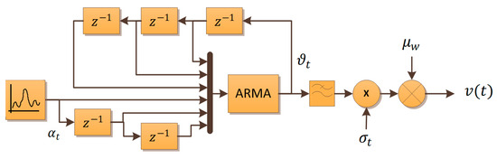 Finally, to test the system with wind behavior, including gusts, an autoregressive moving average (ARMA) model was implemented. This model generates a wind profile with a normal distribution based on a specified mean and variance [47]. This algorithm models the wind speed according to Equation (21) as the sum of two components: an average speed and an instantaneous turbulence , which is modeled as a first-order Gaussian noise-excited filter as shown in Equation (22) (where is the time constant, and represents Gaussian noise with a mean of 0). With the filtered noise, the instantaneous turbulence is expressed in Equation (23), where is the standard deviation of the wind speed, and is the ARMA time series model expressed in Equation (24). This algorithm was implemented with the block diagram shown in Figure 12.