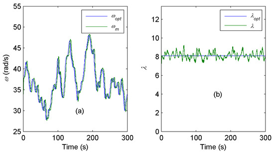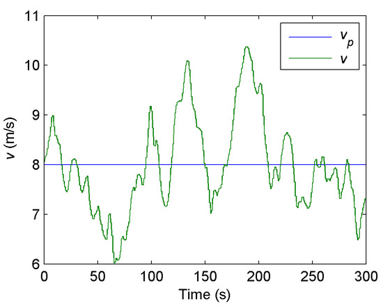 Using the ARMA model, the control algorithm was tested with a wind profile featuring an average speed of 8 m/s and a standard deviation of 0.5 m/s. The experiment lasted 5 min, during which 300 values for the wind speed were generated, one every second. The purpose of this experiment was to verify the operation of the controller in maintaining the turbine operating in . The variables analyzed are the angular speed of the blades and the speed ratio. Figure 13 shows the wind speed used in the experiment, Figure 14a illustrates the angular velocity response, and Figure 14b shows the speed ratio compared to the optimum.