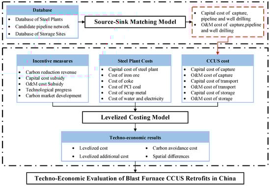 An effective technical evaluation indicator is crucial for addressing stakeholders’ negative views on CCUS technology [32]. Levelized cost generally refers to the levelized cost of electricity (LCOE), which is widely used to demonstrate the economic feasibility of a certain power generation technology [33,34,35,36], such as tidal energy projects [37], variable renewable energy [38], photovoltaic power generation [39,40,41], technical and economic evaluation of straw-fed biomass power plants [42], and investment in wind farms [43,44,45]. However, research on the levelized cost of CCUS retrofits for blast furnaces in steel plants in a specific country/region is still lacking.