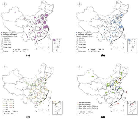 Layout of steel plants, pipelines, and storage blocks. (a,b) describe the location distribution of crude steel production capacity (Mt/a) and blast furnace flue gas CO2 capture capacity (Mt/a) of the selected steel plants, respectively, and distinguish whether the steel plants are involved in source–sink matching or not. (c) describes the distribution of pipes involved in source–sink matching and their sizes. (d) describes the types of storage blocks involved in source–sink matching and their location distribution.