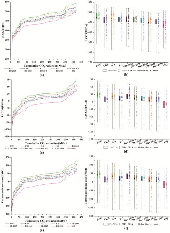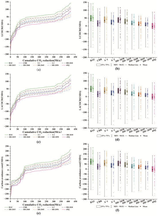 Under the BAU scenario, the LACOCD of blast furnace CCUS projects in steel plants ranges from −134.87 to 142.95 USD/t, with median and mean values of 52.51 and 46.39 USD/t, respectively. Among them, the 16 steel plants with negative LACOCD values can achieve a 41.84 Mt/a CO2 emission reduction, accounting for 9.96% of the CO2 abatement potential. The 33 steel plants with an LACOCD ranging from 0 to 50.00 USD/t can achieve an 89.86 Mt/a CO2 emission reduction, accounting for 21.39% of the CO2 abatement potential. The 45 steel plants with an LACOCD ranging from 50.00 to 100.00 USD/t can achieve a 229.47 Mt/a CO2 emission reduction, accounting for 54.63% of the CO2 abatement potential. From Figure 3d, the LACOCD of the blast furnace CCUS project in steel plants is mainly concentrated between 25.00 and 75.00 USD/t, and 66 steel plants can achieve a CO2 emission reduction of 251.43 Mt/a, accounting for 59.85% of the CO2 abatement potential.