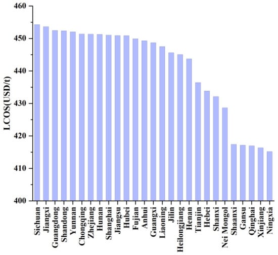 Influenced by regional differences in the prices of various resources in the production process of steel plants, the LCOS of steel plants before a CCUS retrofit shows significant inter-provincial differences, as shown in Figure 4. The LCOS of China’s steel plants before a CCUS retrofit ranges from 415.20 to 454.30 USD/t, with an average value of 441.34 USD/t. The three provinces with the largest LCOS are Sichuan (454.30 USD/t), Jiangxi (453.65 USD/t), and Guangdong (452.49 USD/t), and the three provinces with the smallest LCOS are Ningxia (415.20 USD/t), Xinjiang (416.38 USD/t), and Qinghai (416.98 USD/t). In addition, the LCOS of Hebei, Jiangsu, and Shandong provinces, which ranked as the top three in terms of crude steel production in 2020, are 433.86, 450.93, and 452.39 CNY/t, respectively.
