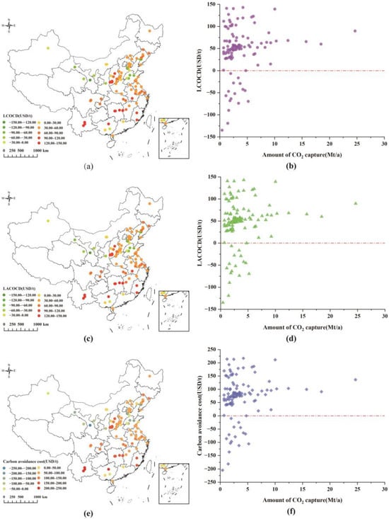 The relationships between the levelized cost, levelized additional cost, and carbon avoidance cost of the CCUS full-chain project of the blast furnace in the steel plant under different scenarios and cumulative CO2 reduction and their distributions are shown in Figure 3, and they reflect the economics of the CCUS retrofit projects for blast furnaces of existing BF-BOF steel plants. As can be seen from Figure 3a,b, the LCOCDs of some blast furnace CCUS projects are negative, which means that these steel plants can profit from CCUS retrofit projects, and this is largely due to the matching of these steel plants with oil fields and obtaining crude oil revenue from them.