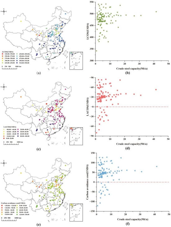 While the interprovincial differences in raw material prices make the LCOS of steel mills exhibit interprovincial differences before a CCUS retrofit, the LCOS after a CCUS retrofit exhibits significant plant-level differences (Figure 7b), and the distribution pattern is somewhat different from that of the LCOCD. The LACOS and carbon avoidance costs of steel plants showed a similar distribution to the LACOCD and carbon avoidance costs of CCUS projects. This indicates that the impact of provincial differences in raw material costs is weaker than that of CCUS projects, i.e., from an economic perspective, more consideration should be given to the CCUS project itself than to the province where the steel plant is located when deploying a blast furnace CCUS project. The levelized cost, levelized additional cost, and carbon avoidance cost of steel plants with CCUS retrofits to blast furnaces also exhibit similar differences in spatial distribution as those of blast furnace CCUS projects (Figure 7a,c,e).