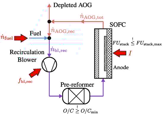 In terms of system operation and control, AOGR, therefore, leads to a higher degree of complexity, as the system can be considered a coupled and constrained nonlinear multi-variable control problem. Three manipulated variables (MVs), depicted as red arrows in Figure 1, namely the molar fuel flow n ˙ fuel , the electrical stack current I, as well as the electrical rotation frequency of the recirculation blower f bl , rec , proportional to the rotational shaft speed, affect the behavior of the anodic gas supply. Several aspects not depicted in Figure 1 may further increase the nonlinear plant behavior and control complexity: (i) AOGR typically features a set of heat exchangers in order to preheat the anode inlet gas and to utilize the released heat of the depleted combustibles in an afterburner, thus adding nonlinear thermal coupling in the recirculation loop. (ii) Higher levels of system heat integration can be achieved if the cathode off-gas is not only utilized for heat recuperation but also to oxidize the depleted AOG in the afterburner. This leads to a coupling of cathode molar flow and pre-reforming temperature, thus adding a fourth manipulated variable to the recirculation loop behavior.