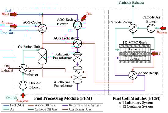 In this study, a methane-fueled SOFC system with AOGR is examined, which was developed within the MultiSchIBZ research project and already explained in detail in a prior publication [7] (see Figure 2). The design objective was focused on a parallel setup of one or multiple fuel cell modules (FCMs) and a central fuel processing module (FPM). Spatial separation of the pre-reformer and the SOFCs is not advantageous from the perspective of heat integration but offers the advantage of a modular design and comparatively easy replaceability of degraded stack modules and materials like catalysts. The use of different fuels is achieved by only adjusting the FPM in its layout whereas the fuel cell modules may remain unchanged.