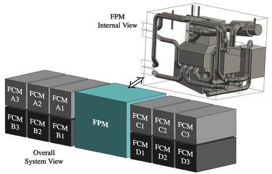 Figure 3. Scaled-up intermodal container system consisting of a central fuel processing module (FPM) and twelve fuel cell modules (FCM), arranged in four parallel branches of three modules each.