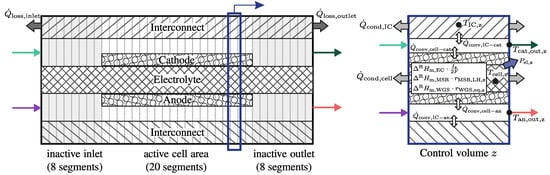 In order to obtain an accurate plant model for dynamic system analysis, a one-dimensional stack model close to the variant of van Biert is chosen, as the investigated stacks in the laboratory-scale system are almost identical to the stack from the cell manufacturer Sunfire GmbH experimentally validated in [24]. Figure 4 illustrates the discretization of the chosen model layout in the flow direction as well as the underlying assumptions of heat loss distribution to the manifolds, the periodic boundary condition at the interconnects, the neglect of radiation as a heat transfer phenomenon inside the stack, as well as using the more advanced Langmuir–Hinshelwood MSR reaction kinetics model. However, the ASR approach from Engelbracht is chosen as it represents a suitable simplification for electrolyte-supported cells in the targeted fuel utilization range. Furthermore, parameterization of the electrochemical model is possible by means of experimental single-cell measurements. The active cell area in this publication is divided into 20 control volumes with 8 + 8 chemically inactive manifold control volumes upstream and downstream which was found to represent a good compromise between accuracy and computation time.