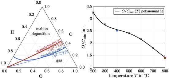 The O / C min temperature polynomial fit of the fifth order (shown in Figure 5 and deducted from threshold lines kindly provided by Jaworski et al. [37] at atmospheric pressure) is given as:
