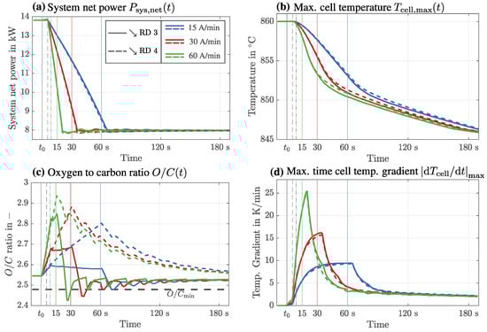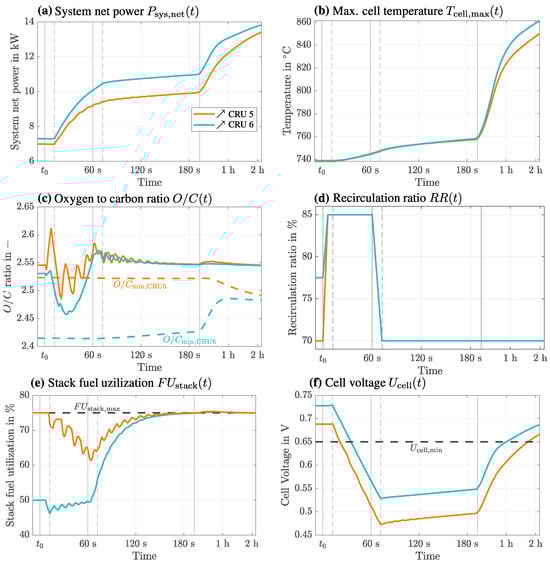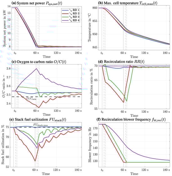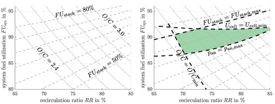 The lower limit of this parameter depends on the pre-reforming reaction temperature O / C min = f ( T ) , as carbon deposition on the catalytic surfaces may occur otherwise. As shown in previous studies, operation in the boundary region ( F U stack F U stack , max ; O / C O / C min ) is desirable with regard to high system efficiencies [12,13].