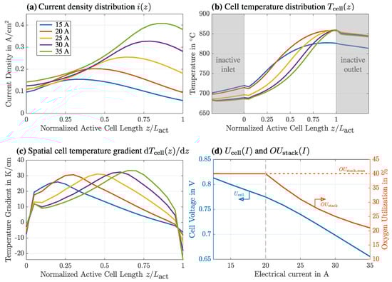 • Electrochemical modeling: Engelbracht used a lumped area-specific resistance (ASR) approach to quantify the local voltage losses in each control volume, whereas the other models differentiate between ohmic, activation, and concentration overpotentials, thus, if parameterized correctly, yielding a physically more accurate model, yet with significantly higher computational effort. The ASR assumption that an overall resistance depends only on temperature, resulting in a linear current–voltage characteristic, could be experimentally confirmed with a planar short-stack up to a stack fuel utilization of F U stack = 80 % [25]. However, using this simplified approach may result in deviations at (i) higher fuel or air utilization, due to the neglect of mass transport phenomena, and (ii) cells with a higher proportion of activation overpotentials, which does not occur in this simulation study.