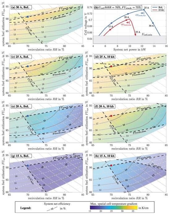 • A comprehensive overview of the permissible steady-state operating range presented in Section 4 and constrained by a set of operating limits associated with stack degradation. Appropriate system operating parameters will be presented as a function of both electrical load and stack degradation. Evaluation will be based on the system’s net efficiency and thermal gradients inside the stack.