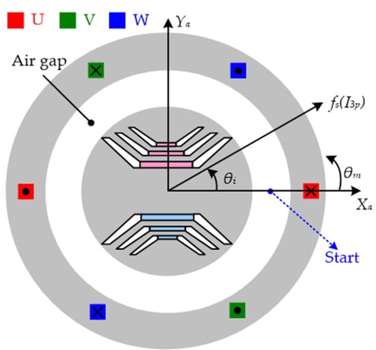 The simplified schematic of an elementary three-phase, two-pole synchronous motor is shown in Figure 1. The stator’s MMF (denoted as fs) is generated by a three-phase composite current I3p. In Figure 1, θi and θm denote the lead current and mechanical angles, respectively.