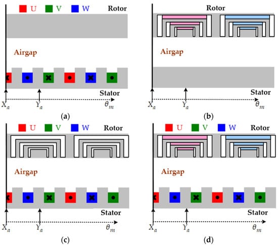 Types of flux-density-produced mechanisms in the air gap: (a) flux density produced by the current (Bs); (b) flux density produced by the PM (BPM); (c) flux density produced by the rotor (Br); and (d) sum of BPM and Br (Bg).