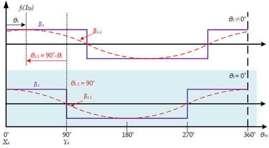 where Ip and I3p are the peak values of the single-phase and three-phase current, respectively. A schematic of the lead current angle, the magnetic flux, and the flux density generated by the stator current is displayed in Figure 4. When the lead current angle increases, the Bs waveform moves farther away from the Xa-axis, defined as the motor’s mechanical starting point, equivalent to a lag effect at the air gap coordinates. Moreover, the sum of the current lead angle θi and the flux density angle of the stator θs is 90°.