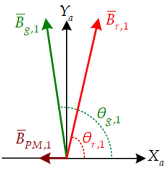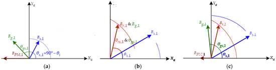 where Bg,1 and Bs,1 are the peak fundamental components of Bg and Bs, respectively. The term θgs,1 denotes the angle between Bg,1 and Bs,1. The flux Bs is generated by the three-phase stator currents at t = 0, and these currents are defined as follows: