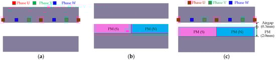 - The flux density generated in the air gap by the PM (BPM) is unaffected by the stator slot and stator winding, as displayed in Figure 3b;
